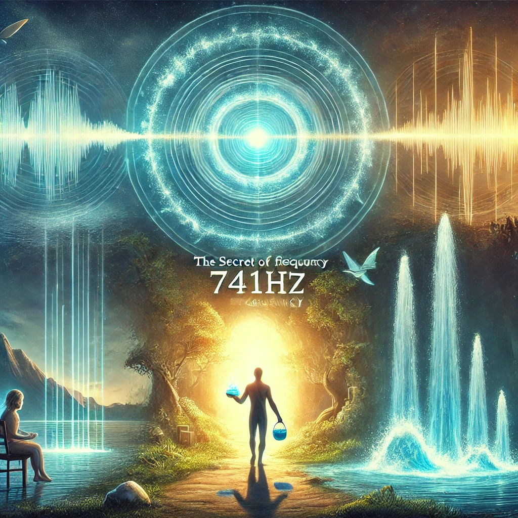DALL·E 2024-08-25 20.04.02 – An illustration depicting the secret of 741Hz frequency and its transformative power with water and salt. The first scene shows a mystical cleansing r