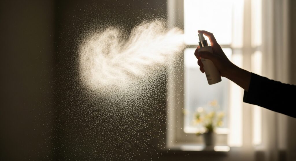 お清めスプレーは、空間の四隅や、外からの気が入り込む玄関、そして自分自身の背後(肩越し)に噴射するのが最も効果的です。